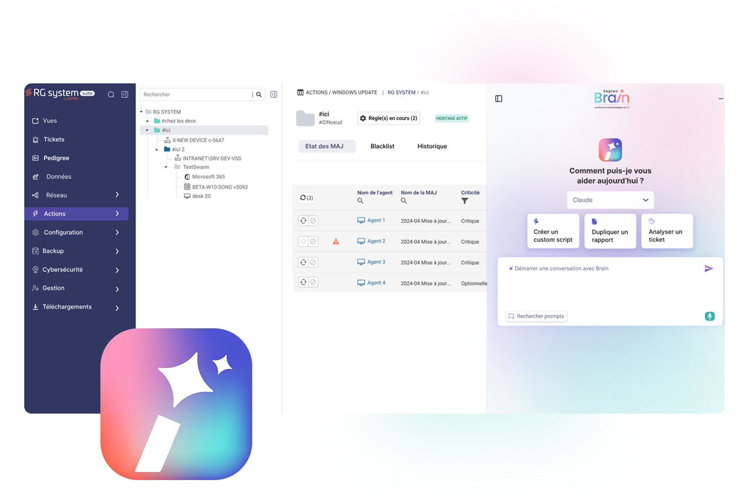 Intégrée à la plateforme RG System Suite, l'IA Brain met de l’ordre dans la complexité : elle aide vos techniciens à analyser, prioriser, préparer les actions et peut les exécuter à la demande.